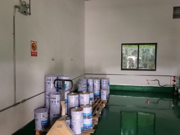 企業生產過程中使用的危險化學品為PU漆和UV漆。PU漆包括PU漆底漆、PU漆面漆、PU稀釋劑、PU漆固化劑,火災危險性均為甲類;UV漆包括UV底漆、UV面漆,火災危險性均為丙類。PU漆在噴漆工藝中使用,使用地點為3#廠房2層噴漆間內,共設有2個噴漆間。UV漆在輥涂工藝中使用,使用地點為3#廠房2層輥涂車間內,共設有2條輥涂生產線,另外,3#廠房2層設有1個調漆間。企業危險化學品儲存場所為廠區東南角的危險化學品倉庫,危險化學品倉庫分為2個隔間,分別儲存危險化學品和危險廢物,廠區內未設置危險化學品中間倉庫。